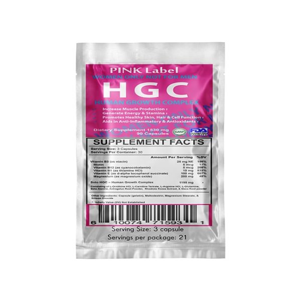 HGC—HUMAN GROWTH COMPLEX PINK label is generated with the purpose of helping relieve age causing conditions in women. It’s always a perfect time to take better care of ourselves as women.  Our formula is aimed to help stave off complaints aging women have, such as decreased muscle & bone mass, excessive body fat, loss of physical stamina & energy, and decreased mental focus.